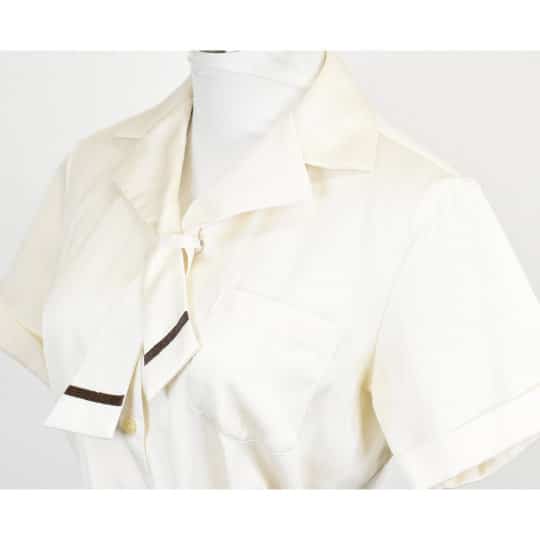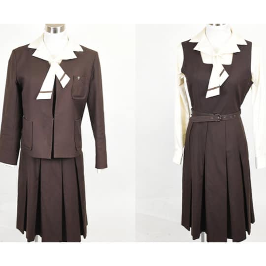 リボン付きの白いブラウスに、茶色のジャンパースカート、そして茶色のボレロタイプの上着を合わせたスタイルです。このユニークなデザインは60年以上にわたって愛され続け、地域のシンボルとして親しまれてきました。